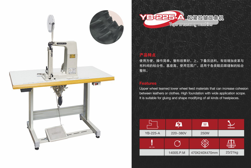 使用方便,操作简单,整形效果好。上、下叠压送料,有效增加皮革与布料间的粘合性。基座高、使用范围广。适用于各类鞋后跟缝制的粘合整形。