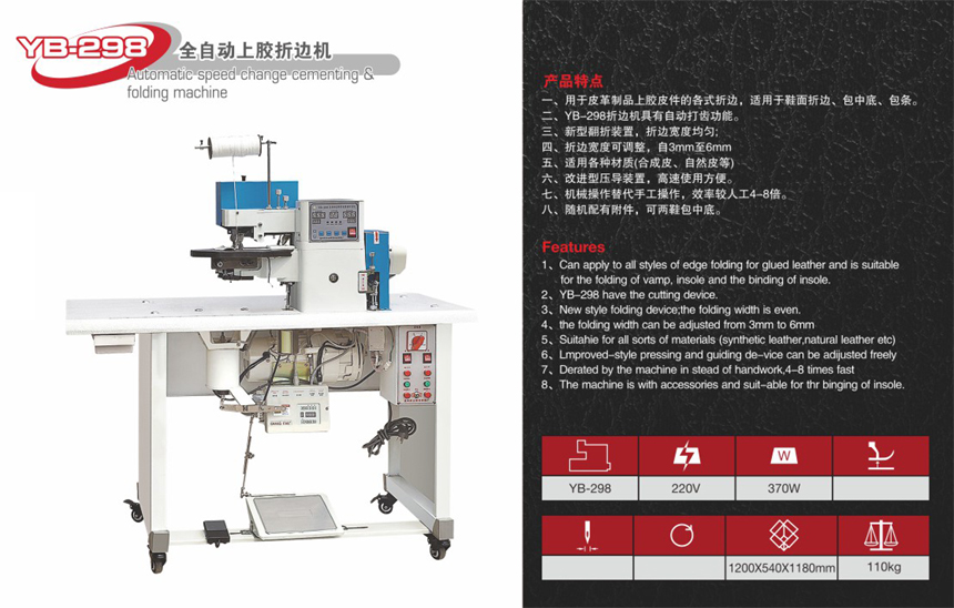 该机用于鞋带、箱包、手机套等各种皮制品的PVC、PU、天然皮、人造皮、布料材质的接缝进行自动分边,上胶,锤平的多工序一休化作业。通过该机操作能提高工作效率,减少工序,不伤面料等优点.